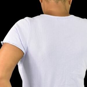 Frankies Bikinis Baby Tee FEATURES a simple classic cropped silhouette with high crew neck. Short baby sleeves with lettuce hem. Boxy fit. Made in USA.