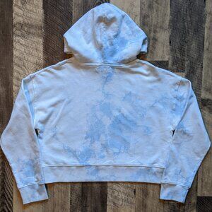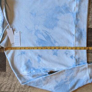 This is a Frankies Bikinis Burl Hoodie in Baby Blue Tie Dye. It is new with tags. It is a size large, and the last three images show measurements. Oversized relaxed fit with a cropped length. Pullover style, fixed hood, long sleeves, soft 100% cotton, warm fleece interior, ribbed cuffs and hem.