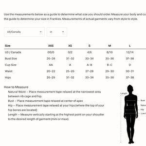 - M: US/Canada 8/10, Bust 35-36", Cup B-C, Waist 29-30", Hips 35-36"