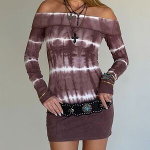 Frankie's Bikinis Purple Tie Dye Off-The-Shoulder Long Sleeve Slim Fitted Cinzia Mini Dress Y2K Festival Beach Resortwear.