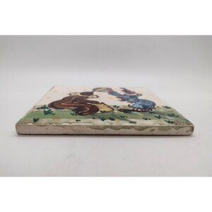 This is a very cute well painted clay tile with 2 circus clowns playing outside & is signed by the artist. I believe the name of the artist is Svas as is shown in the front. Tile measures 4.25" each way.