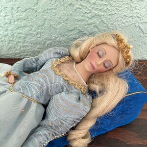 This exquisite Franklin Mint Sleeping Beauty doll captures the elegance and magic of the beloved fairy tale. Measuring approximately 20 inches, she reclines on a luxurious dark blue satin chaise lounge with a subtle leaf motif—an elegant nod to her enchanted slumber.