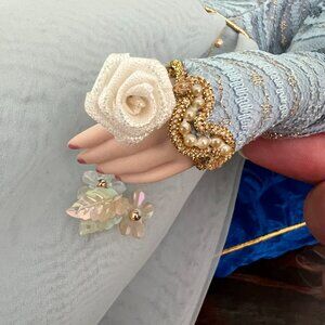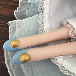 Her golden curls cascade gently around her porcelain face, which features delicately hand-painted details: soft silver eyeshadow, rosy lips, and real eyelashes that enhance her serene expression. She wears a layered sheer gown in pale blue, adorned with floral sequins, pearl accents, and gold embellishments along the neckline and sleeves. Her feet are dressed in dainty blue porcelain slippers with golden puffs, and she wears a golden crown befitting her royal lineage.