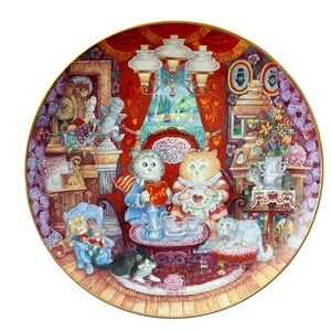 Franklin Mint Heirloom Bill Bell Whisker Wuv Collector Plate. In good preowned condition with a small scratch to the middle of the plate (see circled pic) and light darkening to the bottom rim. Named Whisker Wuv and features two cats in a posh living room with a Valentine’s Day theme. Part of the Franklin Mint Recommendation and not made for food use. Stamped Plate #KA1343.