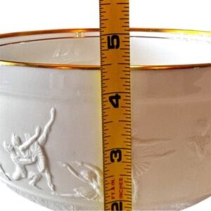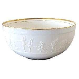This bowl was produced in a limited edition of 150 to commemorate the 75th anniversary of The Royal Ballet in 2006. It was designed by June Mendoza and made by Wedgwood. The bowl is made of fine bone china and features a gilt rim and bas-relief depictions of dancers.
