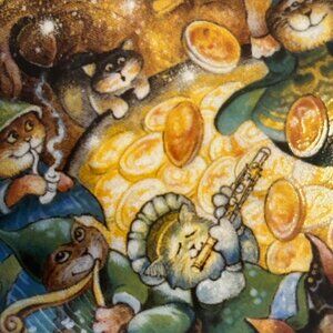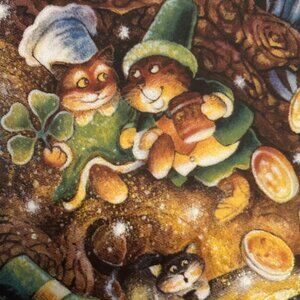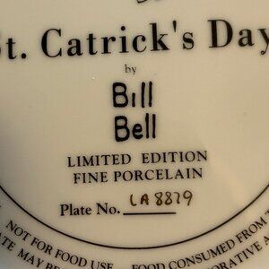 This limited edition porcelain plate, titled "St. Catrick's Day," is in excellent condition and comes in its original box, with certificate of authenticity and a small plate stand. It is the St. Patrick's Day plate in a series of monthly cat-themed plates by artist Bill Bell. Bill Bell is a Philadelphia native and self-taught artist who began painting full-time in 1982. He previously worked as a musician and record company executive but found his artistic passion in creating complex and detailed scenes of people, pets, dreams, and events. He works with brilliant acrylic colors and creates depictions of memories and impressions that have shaped his life. Bell’s paintings can be described as pleasant, absurd, and nostalgic, with each work of art exuding the joy that he chooses to see in the world.