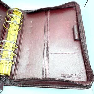 This Franklin Quest leather planner cover is crafted from full grain Aniline Burgundy leather, providing durability and a classic look. Designed with a 6-ring binder system, it accommodates various planner refills, making it a versatile tool for organizing schedules and notes efficiently.