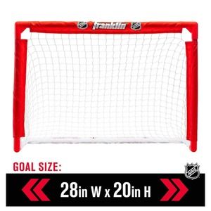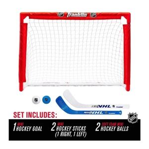 Material: Plastic Brand: Franklin Sports Team Name: NHL Color: Red League: NHL Introduce your young player to all the fun and action of hockey with the Franklin NHL Mini Goal, Stick and Ball set. The mini goal features rugged high-impact 1.25" plastic tubing and a durable all-weather 420 denier nylon net. Includes 2 mini sticks and 2-2" foam hockey balls. Easy to assemble and durable for years of fun for your hockey fans This mini hockey set is a fun, durable way to introduce young players to the game. Measuring 28-by-16-inches (W x H) and featuring high-impact 1.25-inch plastic tubing, the goal assembles in minutes with precision-fit couplings that provide rigid durability. A durable, 900-denier all-weather polyester net with 420-denier nylon sleeve will hold up to years of heavy use. The set comes complete with two 18-inch mini-sticks and two soft EVA foam mini balls. Features & details ABS Imported Imported ALL IN ONE SET: This set has everything you need to start the mini hockey fun all in one box! INCLUDES: (1) 28" x 20" mini goal , (1) right handed mini stick, (1) left handed mini stick, and (2) foam mini hockey balls EASY ASSEMBLE: The easy assemble mini goal snaps together in seconds and comes with a slide on sleeve net so you can spend less time setting up and more time playing! LIGHTWEIGHT AND PORTABLE: This goal set is super lightweight and easy to take on the go so you can bring the game THIS ITEM IS NOT INTENDED FOR USE BY CHILDREN 12 AND UNDER
