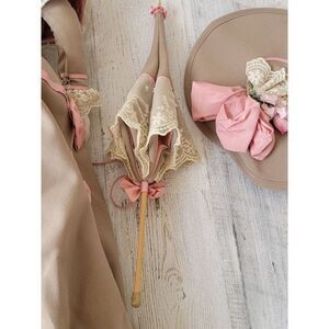 Product hair has some fraying and mild tangling, mild scratches and marks, under garment under dress at bottom has some rips and tears in fabric, no box, comes with hat and umbrella, but otherwise in good condition