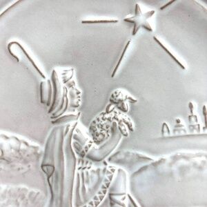 FEATURES: Decorative plate suitable for wall hanging. Features an ivory glaze with a dimensional image of a kneeling shepherd and lamb looking at the Star of Bethlehem.