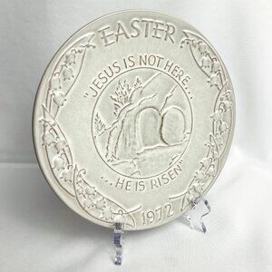 This 1972 Frankoma Easter Plate is a beautiful and meaningful piece of collectible red clay pottery featuring an embossed design with the word "EASTER" at the top. Below this, there is an image of an empty tomb with a stone rolled away, symbolizing the resurrection of Jesus Christ. Surrounding the tomb image is the inscription: "JESUS IS NOT HERE... HE IS RISEN." The plate has a hole at the base, which allows it to be hung or placed on a plate easel.