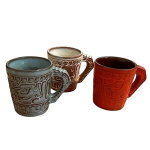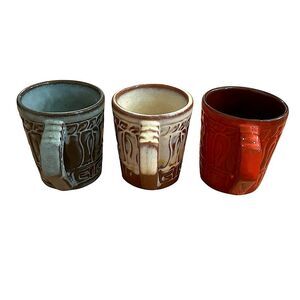 Frankoma Set of 3 Aztec Design Red, Cream Brown, and Blue Cups or Mugs 7cl