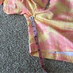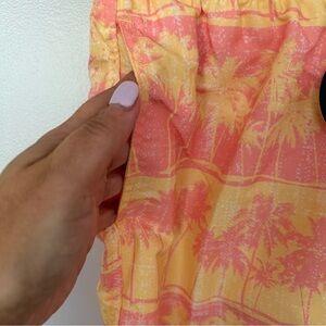 Orange and pink swim trunks with tropical pattern