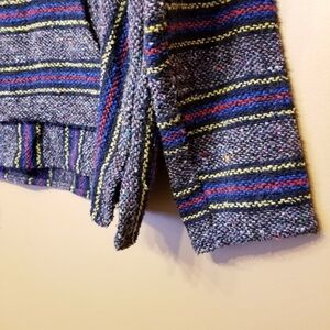 Striped gray v-neck acrylic hoodie pullover from Frank's Textiles, size large. Fabric: 100% acrylic. Made in Mexico. Large front pocket/pouch with side slit and a hood. Excellent pre-owned condition; no flaws.