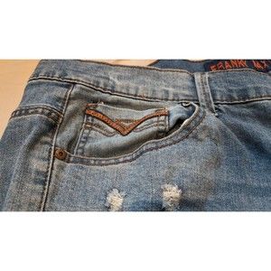 Franky Max men's denim jeans with heavy distressing on the front and back and leather or faux leather trim on the pockets. Good pre-owned condition.