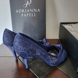 Purchased these for my wedding but chose a different shoe. New in box. Beautiful Navy Blue. Satin and Lace w/ silver glitter strip on inside of the heel.