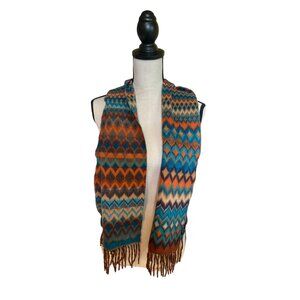 Fras Feel Cashmink Womens Rectangle Scarf Zigzag Fringe Blue Orange Brown Warm