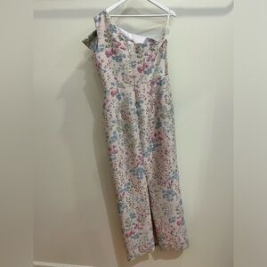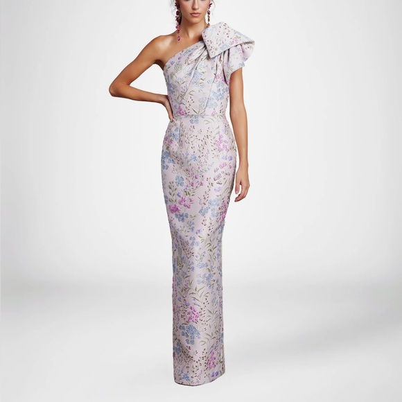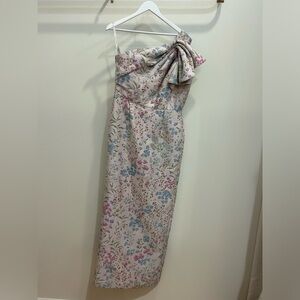 Elegant floral one-shoulder dress with a bow detail. Features a mix of pink, blue, and green floral patterns.