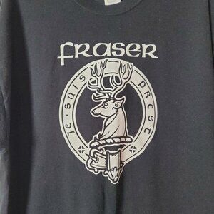 clan Fraser shirt, Scottish clan tee, stag crest t-shirt, Jerzees 2xl shirt, cotton blend shirt, unisex black tee, clan motto apparel, heavyweight t-shirt, Scottish pride shirt, casual clan shirt, Scottish heritage wear, vintage-inspired shirt, traditional crest tee
