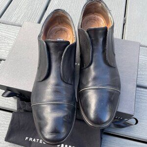 Black leather slip-on Oxford with a cap-toe design up front. The shoe is no-lace and is secured by elastic. Hard leather sole.