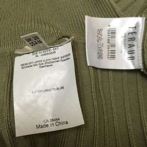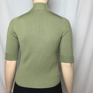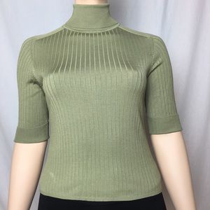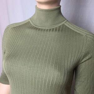 An unvisible tear where the turtle neck attaches to the back. 80% silk. 20% spandex.
