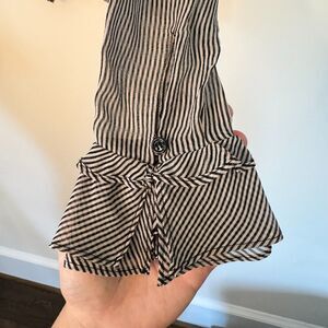 Made from 100% silk, this lightweight striped blouse exudes elegance and versatility. The black and white stripes create a timeless look, while the delicate ruffle detailing along the button-down front and on the cuffs adds a chic, feminine flair. The cuffs can be buttoned closed or worn open, making it adaptable for various occasions. Whether you're heading to work or dressing up for the weekend, this blouse transitions seamlessly through all seasons. Its breathable, lightweight fabric allows for easy layering or wearing on its own, perfect for staying stylish and comfortable year-round.