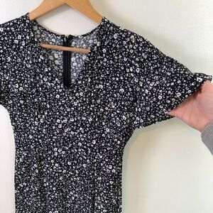 V neckline, Front buttons on bust from top to waist. Flutter short sleeves. Black background with white little flower print. Tie at back. Back zip. Unlined.