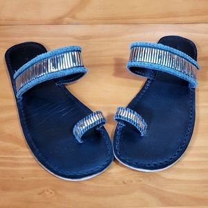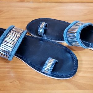 Super unique retail sample. Frayed and intentionally distressed fabric and leather sandals with Silver & Gold metallic fiber embellishment on toe loops and vamp straps. Generous size 9. The lining on both straps is soft against skin and the leather footbed is cushioned for comfort. Textured hard rubber soles make for non-slip walking. Pre-owned in VGUC. A slight flaw on the underside of one instep strap is not obvious when they're worn. Offers & bundles welcome.