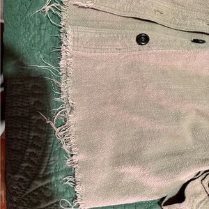 Stylish jacket with frayed hem and button-up design. Features front pockets and buttoned cuffs.