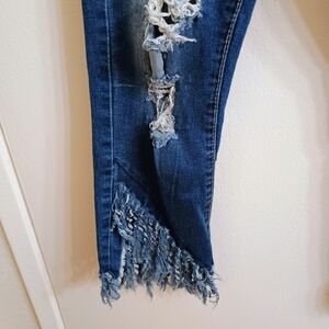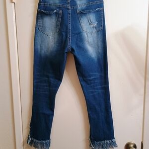 Elevate your style with these chic distressed blue jeans. Featuring a frayed hem and a comfortable fit, these jeans are perfect for any casual outing.