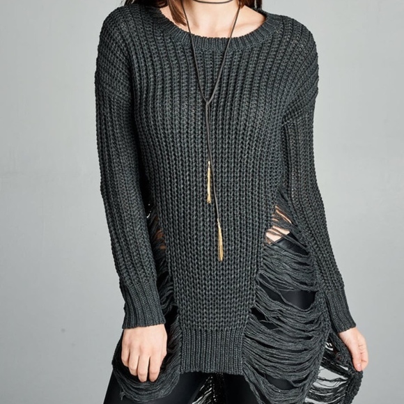 Warm and edgy our Frayed Round Neck Sweater is sure to be a fave in your closet. This sweater is thick with frayed side detail, longer length with a round neck. Longer length perfect for leggings or jeggings. Available in charcoal and burgundy. This listing is for charcoal!