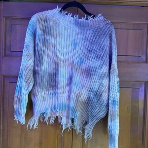 Cozy knit sweater with a frayed hem and tie-dye pattern. Features a V-neck design. Meet and greet length, soft and comfy. Colors are cream, tan, light blue dark gray..