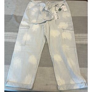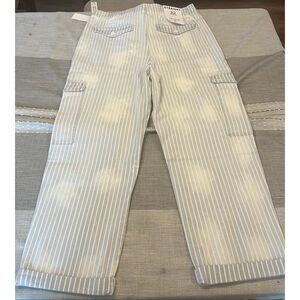STYLE - High rise cargo pant with tie front belt, functional pockets, zipper fly and adjustable rolled cuffs on straight leg.
