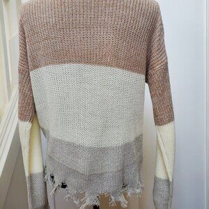 Stay stylish with this edgy frayed hem colorblock sweater. Featuring a blend of cream, gray, and brown, it's perfect for any casual outing.