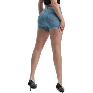 Frazzle Mid Blue High Waisted Summer Elastic Folded Denim Shorts for Women
