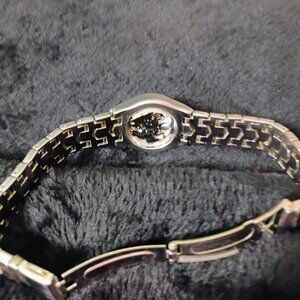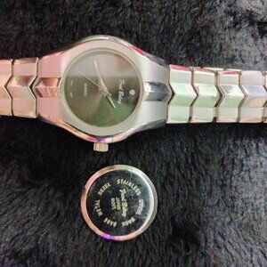 Fred Belay. Japan Movt. Silvertone with gunmetal colored dial. Has a faux diamond at 12.