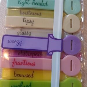 Each one a different color and has a WIne related saying on them like," puzzled", "light headed,"