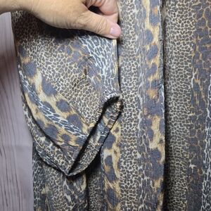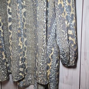 Chic animal print tunic blouse. Features tie-front and relaxed fit. Perfect for any occasion.