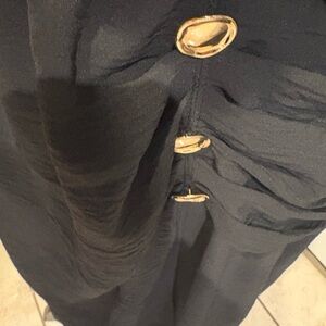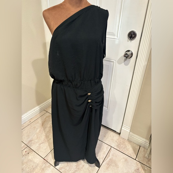 Stylish one-shoulder design. Elegant draping with gold accents. Perfect for any event.