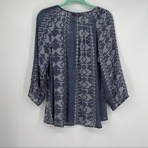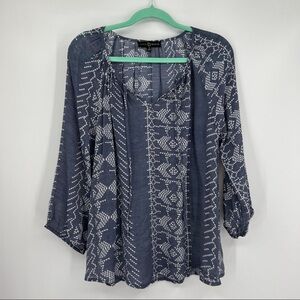 Fred David Geometric Three Quarter Sleeves Scoopneck Drawstring Blue Blouse