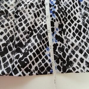 Fred David buttondown blouse. Ruffled front with black piping detail below shoulder on front. Measures flat 19" underarm seam to seam. Sleeve measures 17.5" to button cuff. 24.5" length. Stretch poly spandex print in black white and blue. Size Small EUC