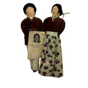 Crafted by the renowned Navajo artist Alta Silago (artist number 409456), these exquisite dolls embody generations of tradition and meticulous craftsmanship. Standing at approximately 8.5 inches tall, their black wool hair cascades down intricately detailed faces that whisper tales of resilience and wisdom.