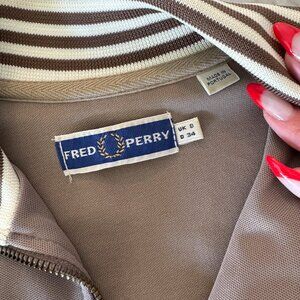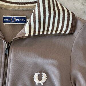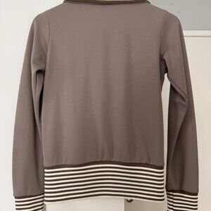 Stylish brown zip-up jacket. Features striped collar and hem. Embroidered logo on chest. Two front pockets.