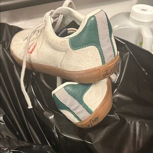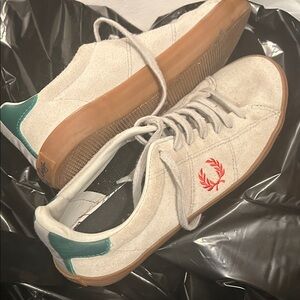 Fred Perry sneakers in cream with green heel and red logo. Casual and stylish design.great condition