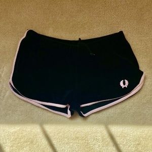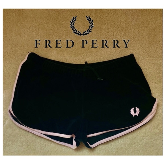 Limited Edition Fred Perry short shorts in sporty black velour with baby pink piping and large embroidered laurel wreath!