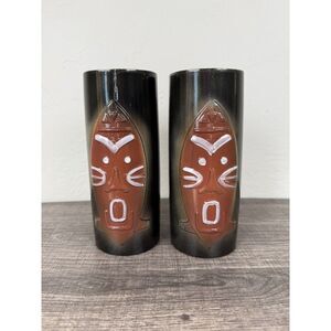 Fred Roberts Set Of 2 TIki Mugs Red Mask Airbrushed Glaze Ceramic Hawaii in good condition. Two small cracks on the inside of one mug, on the opposite sides (shown in the photo). The other mug is in great condition.