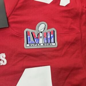 The product is a new, medium-sized Fred Warner San Francisco 49ers jersey by Nike. This official NFL jersey in red features the player's name and number (#54) on the back, perfect for male fans looking to show their support for the team during Super Bowl season. The jersey is a must-have for any die-hard 49ers fan wanting to represent their favorite player on the field.