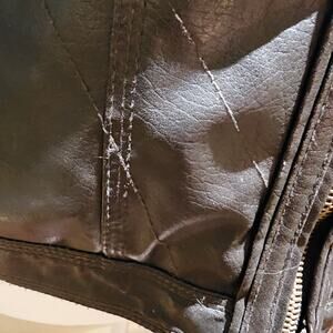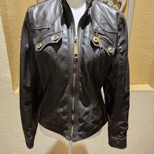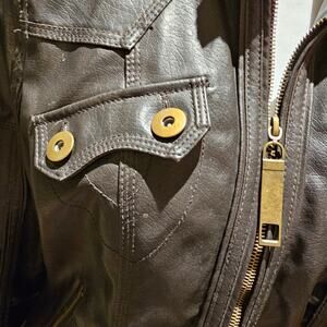 Freda M Brown Faux Leather Moto Jacket Gold Zip Pockets Vegan PVC Lined