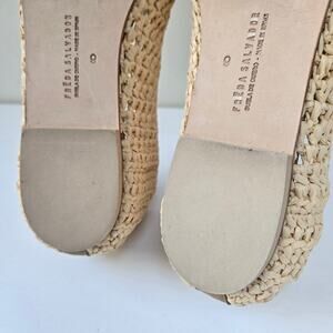 Freda Salvador Jessie raffia summertime ballet flats. Meticulously handwoven in natural ,neutral-colored raffia, the Jessie is equal parts effortless and timeless with its square toe detailing, soft padded footbed, and low-profile construction. Both dressy and functional, this style pair well with jeans and a blazer or baggy trousers.