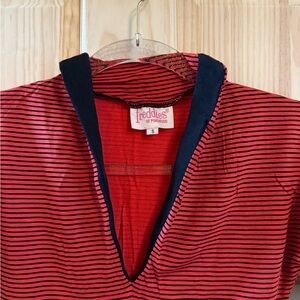 Pasted from previous listing:Freddies of Pinewood retro style striped V top in red with black stripes and solid black lining the V and at the bottom of sleeves and waist band. This is an older production with the white and pink tag. 100% cotton. Great pre owned condition. Slight imperfection in the last photo where material bunches slightly at the right seam behind the neck. Not noticeable when wearing. Otherwise, no flaws to note that I could see. Size small.